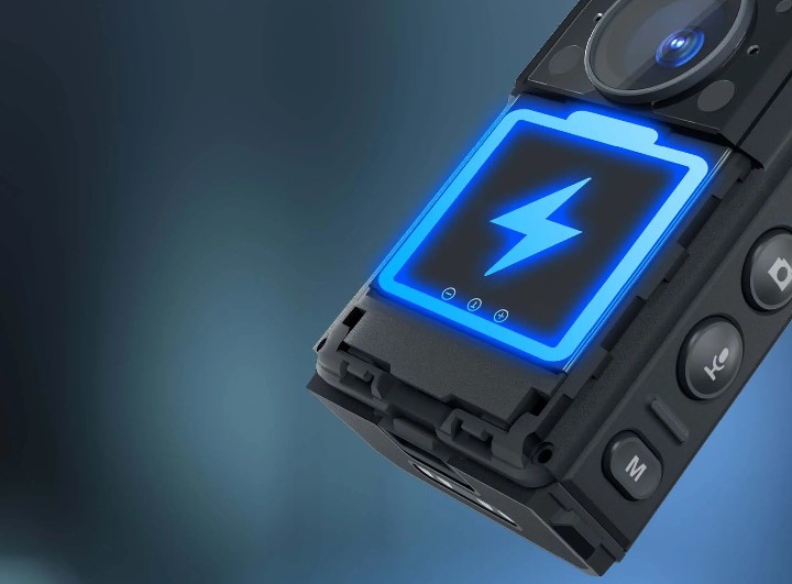 A mini câmera corporal GC550 possui uma bateria principal substituível em campo que pode gravar vídeos continuamente por até 9 horas a 720p. Para um turno extra longo, pegue uma bateria sobressalente e troque-a rapidamente por mais 9 horas. Durante a substituição da bateria, o GC550 pode manter a gravação por 5 minutos graças à bateria de backup integrada.