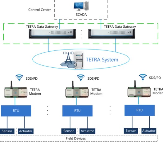 O TETRA Data Gateway (DGW) é um hardware de rede que conecta a estação mestra de Controle de Supervisão e Aquisição de Dados (SCADA) e o sistema TETRA da Hytera. O TETRA DGW recebe instruções da estação mestra SCADA e processa essas instruções, como análise, compactação e encapsulamento, e as encaminha para Modems TETRA.