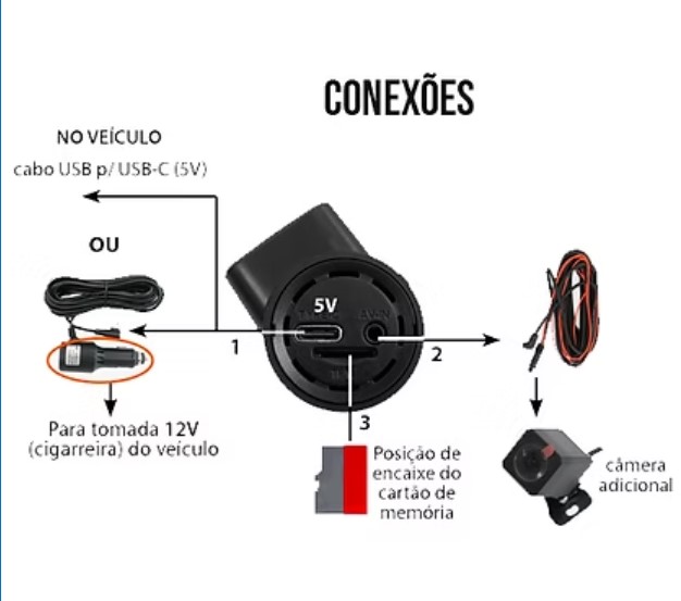 Gravação com cämera rotativa incorporada (visão frontal ou cabine) e com cämera adicional (para instalaçào interna no veículo);